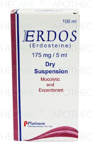 Product Name: Erdos Susp 175mg/5ml 100mlProduct Form: SuspensionPack Size: 100mlMarketed By: Platinum Pharmaceuticals (Pvt) LtdGeneric Category: Mucolytic/ExpectorantIngredients: Erdosteine