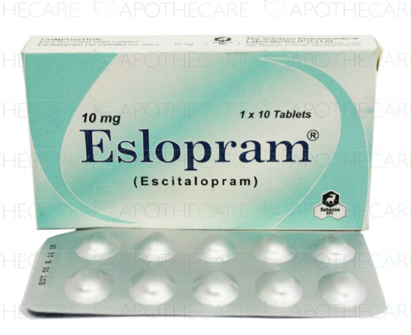 Product Name: Eslopram Tab 10mg 1x10'sProduct Form: TabletsPack Size: 1x10'sMarketed By: Schazoo Pharmaceuticals (Pvt) LtdGeneric Category: Anti-DepressantIngredients: Escitalopram