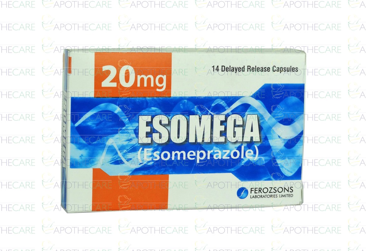 Product Name: Esomega Cap 20mg 2x7'sProduct Form: CapsulesPack Size: 2x7'sMarketed By: FEROZSONS LABORATORIES LTDGeneric Category: Anti-UlcerantIngredients: Esomeprazole