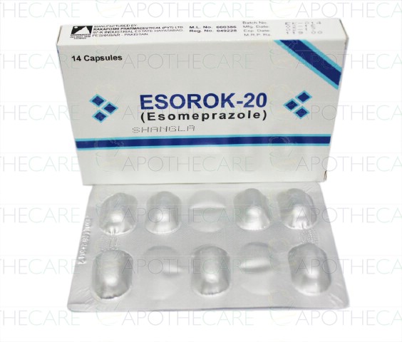 Product Name: Esorok Cap 20mg 14'sProduct Form: CapsulesPack Size: Proton pump inhibitorsMarketed By: Rakaposhi PharmaceuticalsGeneric Category: Anti-ulcerantIngredients: Esomeprazol 20mg