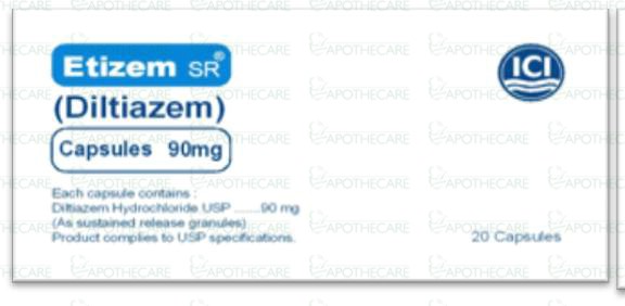 Product Name: Etizem SR Cap 90mg 20'sProduct Form: CapsulesPack Size: 20'sMarketed By: ICI PAKISTAN LTD Generic Category: Anti-Hypertensive Ingredients: Diltiazem HCl