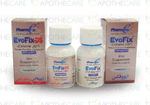 Product Name: EVOFIX Susp 100mg/5ml 30mlProduct Form: SuspensionPack Size: 30mlMarketed By: PHARM-EVO (PVT) LTD.Generic Category: CEPHALOSPORIN ANTIBIOTICIngredients: Cefixime