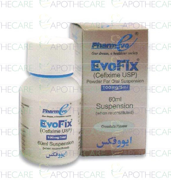 Product Name: EVOFIX Susp 100mg/5ml 60mlProduct Form: SuspensionPack Size: 60mlMarketed By: PHARM-EVO (PVT) LTD.Generic Category: CEPHALOSPORIN ANTIBIOTICIngredients: Cefixime