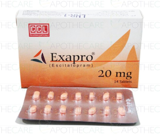 Product Name: Exapro Tab 20mg 14'sProduct Form: TabletsPack Size: 14'sMarketed By: CCL PharmaceuticalsGeneric Category: Anti-DepressantIngredients: Escitalopram
