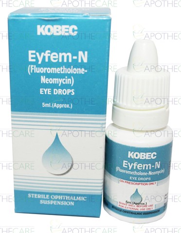 Product Name: Eyfem-N Eye Drops 5mlProduct Form: DropsPack Size: 5mlMarketed By: Kobec health SciencesGeneric Category: Anti-bacterial, CorticosteroidIngredients: Fluorometholone 0.1%, Neomycin0.35%