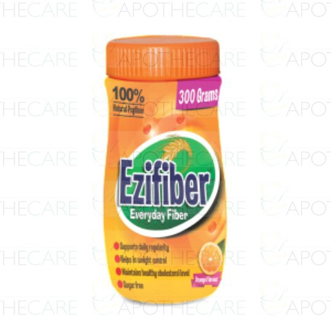 Product Name: Ezifiber Orange Powder 300gm JarProduct Form: PowderPack Size: 300gmGeneric Category: Nutritional SupplementIngredients: Ezifiber is a natural fiber supplement with 100% Ispaghol Husk