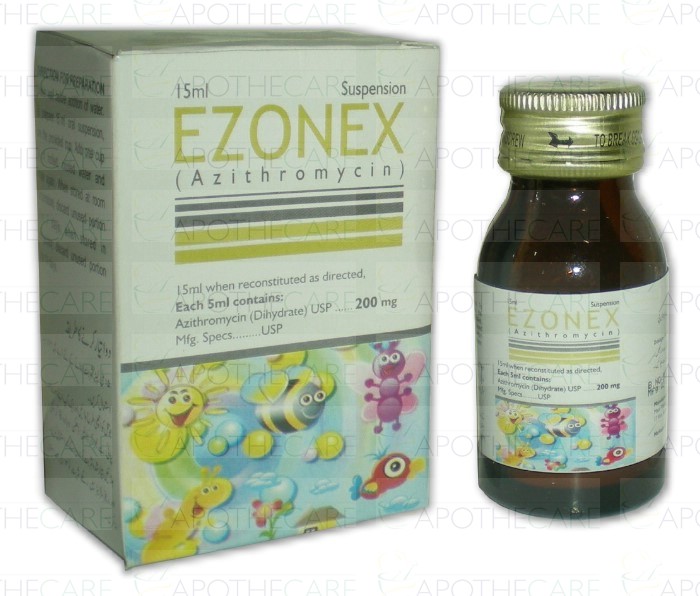 Product Name: Ezonex Susp 200mg/5ml 15mlProduct Form: SuspensionPack Size: 15mlMarketed By: PHARMA HEALTH PAKISTAN (PVT.) LTDGeneric Category: MACROLIDE ANTI-BACTERIALIngredients: Azithromycin Dihydrate