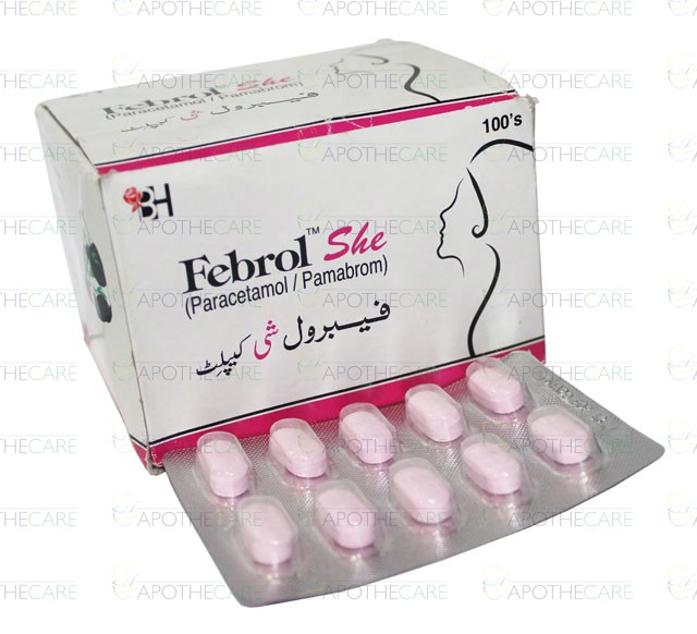 Product Name: Febrol SHE Caplet 100'sProduct Form: CapletsPack Size: 100'sMarketed By: BARRETT HODGSON PAKISTAN (PVT) LTDGeneric Category: Menstrual Pain killersIngredients: Paracetamol 500mg, Pamabrom 25mg