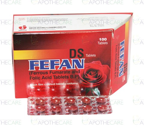 Product Name: Fefan DS Tab 300mg/5mg 100'sProduct Form: TabletsPack Size: 100'sMarketed By: AMSON PHARMA (PVT) LTDGeneric Category: Anti-AnemicIngredients: Ferrous Fumarate 300mg, Folic Acid 5mg