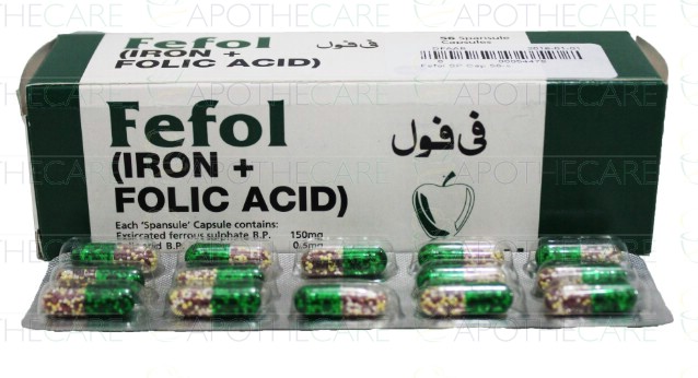 Product Name: Fefol SP Cap 56'sProduct Form: CapsulesPack Size: 56'sMarketed By: GLAXOSMITHKLINEGeneric Category: Anti-AnemicIngredients: Ferrous Sulphate 150mg, Folic Acid 0.5mg