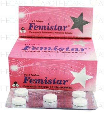 Product Name: Femistar Tab 8x5'sProduct Form: TabletsPack Size: 8x5'sMarketed By: Schazoo Pharmaceuticals (Pvt) LtdGeneric Category: Menstural Pain KillersIngredients: Pamabrom 500mg, Acetaminophen 250mg, Pyrilamine Maleate 15mg