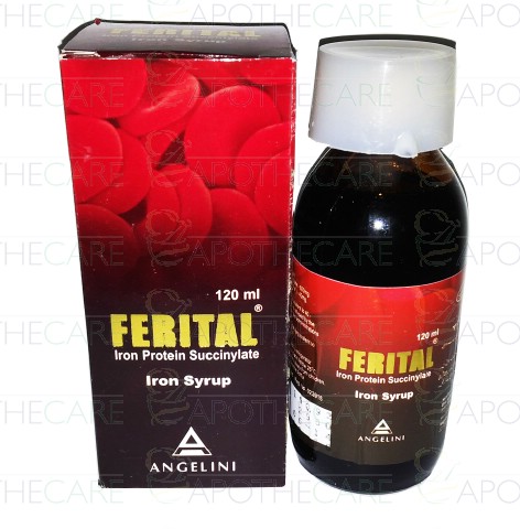 Product Name: Ferital Syp 800mg/15ml 120ml Product Form: SyrupPack Size: 120mlMarketed By: Angelini Pharmaceutricals (Pvt)LtdGeneric Category: Anti-AnemicIngredients: Each 15ml contains: Iron Protein Succinylate 800mg