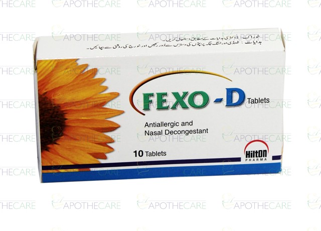 Product Name: Fexo-D Tab 60mg/120mg 10'sProduct Form: TabletsPack Size: 10'sMarketed By: Hilton Pharma (Pvt) Ltd.Generic Category: Anti-HistamineIngredients: Fexofenadine 60mg,Pseudoephedrine-Hcl 120mg