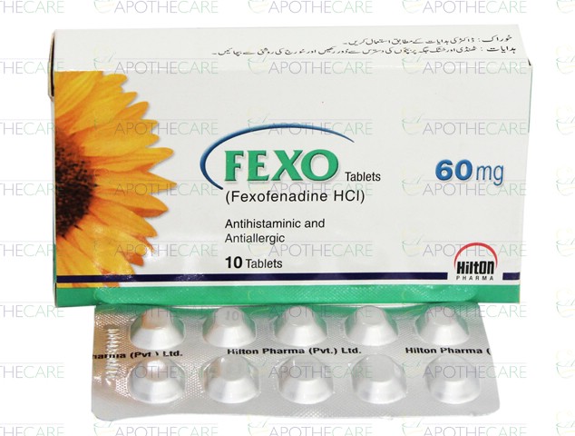 Product Name: Fexo Tab 60mg 10'sProduct Form: TabletsPack Size: 10'sMarketed By: Hilton Pharma (Pvt) Ltd.Generic Category: Anti-HistamineIngredients: Fexofenadine