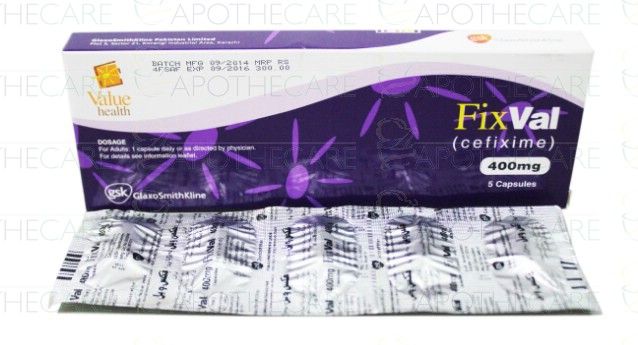 Product Name: Fixval Cap 400mg 5'sProduct Form: CapsulesPack Size: 5'sMarketed By: GLAXOSMITHKLINE Generic Category: Cephalosporin Antibiotic Ingredients: Cefixime
