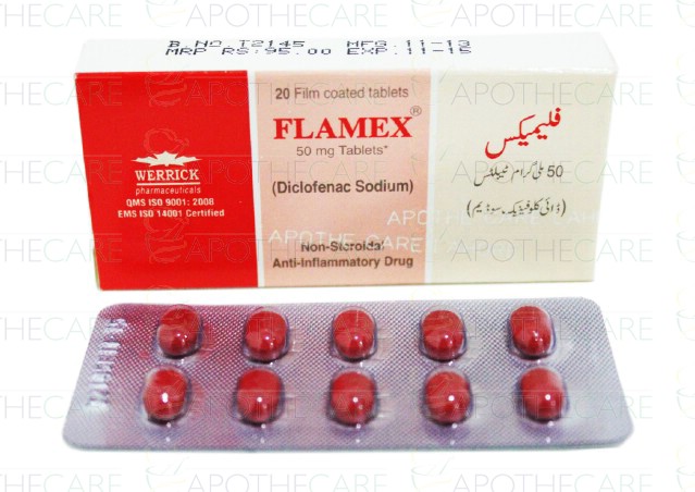 Product Name: Flamex Tab 50mg 2x10'sProduct Form: TabletsPack Size: 2x10'sMarketed By: Werrick PharmaceuticalsGeneric Category: NSAIDIngredients: Diclofenac Sodium