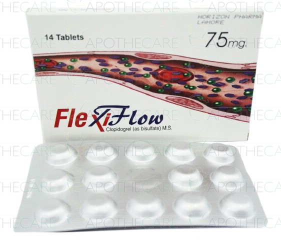 Product Name: Flexiflow Tab 75mg 14'sProduct Form: TabletsPack Size: 14'sMarketed By: Wilshire Laboratories (Pvt) LtdGeneric Category: Anti-Platelet AggregationIngredients: Clopidogrel as Bisulphate