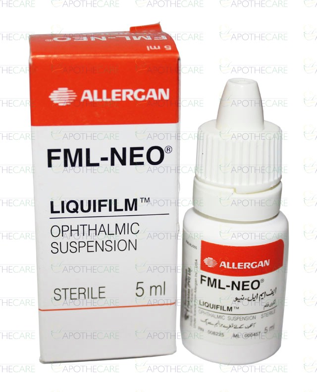 Product Name: Fml-Neo Ophthalmic Susp 5mlProduct Form: Ophthalmic SuspensionPack Size: 5mlMarketed By: BARRETT HODGSON PAKISTAN (PVT) LTDGeneric Category: Anti-Bacterial + CorticosteroidsIngredients: Fluorometholone 0.1%, Neomycin Sulphate 0.5%