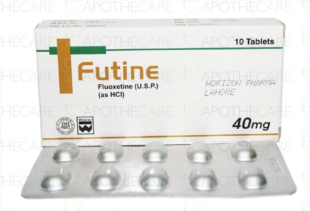 Product Name: Futine Tab 40mg 10'sProduct Form: TabletsPack Size: 10'sMarketed By: Wilshire Laboratories (Pvt) LtdGeneric Category: Anti-DepressantIngredients: Fluoxetine HCl