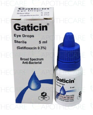 Product Name: Gaticin Eye Drops 0.3% 5mlProduct Form: DropsPack Size: 5mlMarketed By: SCHAZOO PHARMACEUTICALS (PVT) LTDGeneric Category: Anti-InfectiveIngredients: Gatifloxacin