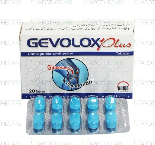 Product Name: Gevolox Plus Tab 20'sProduct Form: TabletsPack Size: 20'sMarketed By: Hilton Pharma (Pvt) Ltd.Generic Category: Disease Modifier For ArthritisIngredients: Glucosamine 500mg, Chondroitin 400mg