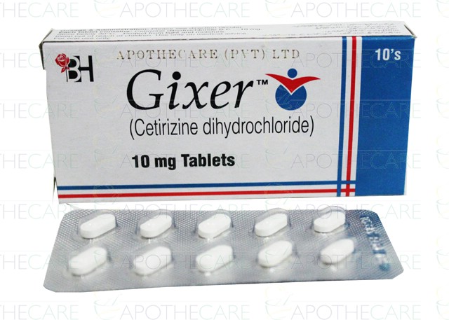 Product Name: Gixer Tab 10mg 10'sProduct Form: TabletsPack Size: 10'sMarketed By: BARRETT HODGSON PAKISTAN (PVT) LTDGeneric Category: Anti-HistamineIngredients: Cetirizine