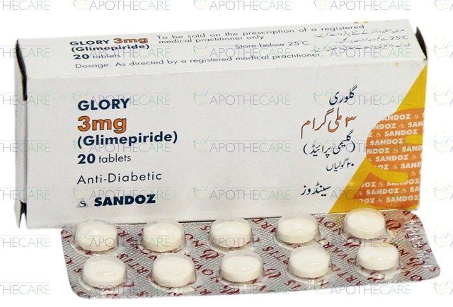 Product Name: Glory Tab 3mg 20'sProduct Form: TabletsPack Size: 20'sMarketed By: NOVARTIS PHARMA PAKISTAN LTDGeneric Category: Oral HypoglycemicIngredients: Glimepiride