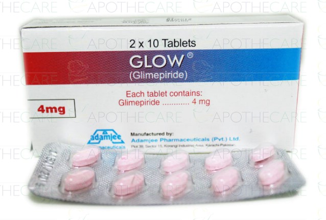 Product Name: Glow Tab 4mg 2x10'sProduct Form: TabletsPack Size: 2x10'sMarketed By: Adamjee Pharma ServicesGeneric Category: Oral HypoglycemicIngredients: Glimepiride