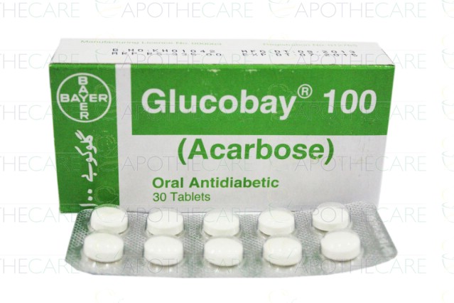Product Name: Glucobay Tab 100mg 3x10'sProduct Form: TabletPack Size: 3x10'sMarketed By: Bayer Health Care Pvt LtdGeneric Category: Oral HypoglycemicIngredients: Acarbose