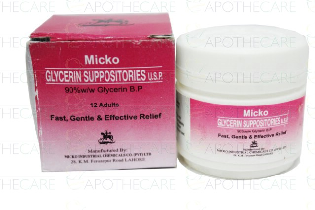 Product Name: Glycerin Suppositories (Adult) 12'sProduct Form: SuppositoryPack Size: 12'sMarketed By:Micko industrial chemicals CO.(Pvt) Ltd Generic Category: LaxativeIngredients: 90% w/w Glycerin B.P