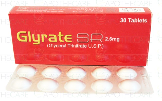 Product Name: Glyrate SR Tab 2.6mg 30'sProduct Form: TabletsPack Size: 30'sMarketed By: Maple Pharmaceutical (Pvt) LtdGeneric Category: NitratesIngredients: Glyceryl Trinitrate