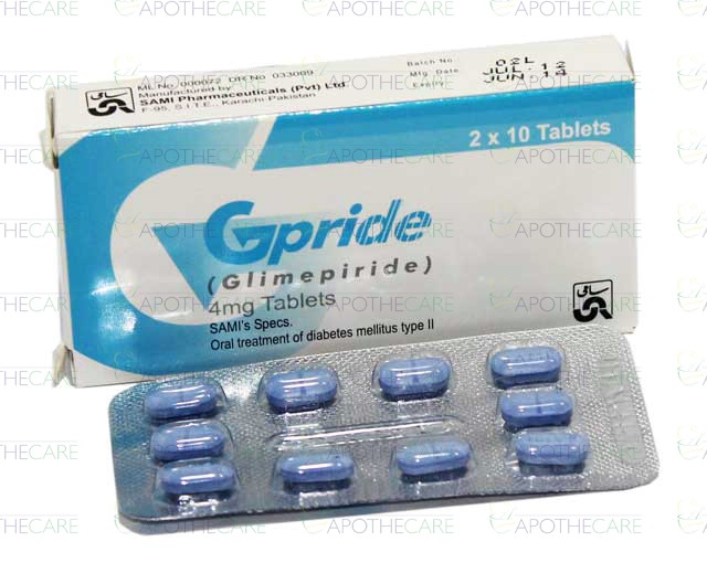 Product Name: Gpride Tab 4mg 2x10'sProduct Form: TabletsPack Size: 2x10'sMarketed By: SAMI PHARMACEUTICALSGeneric Category: ORAL HYPOGLYCEMIC Ingredients: Glimepiride