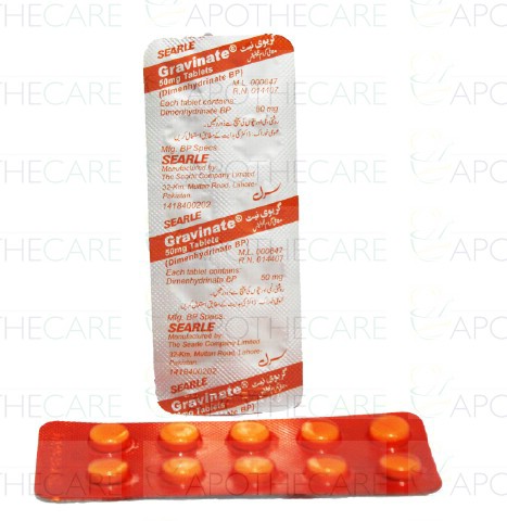 Product Name: Gravinate Tab 50mg 10'sProduct Form: TabletsPack Size: 10'sMarketed By: Searle Pakistan LimitedGeneric Category: Motion SicknessIngredients: Dimenhydrinate