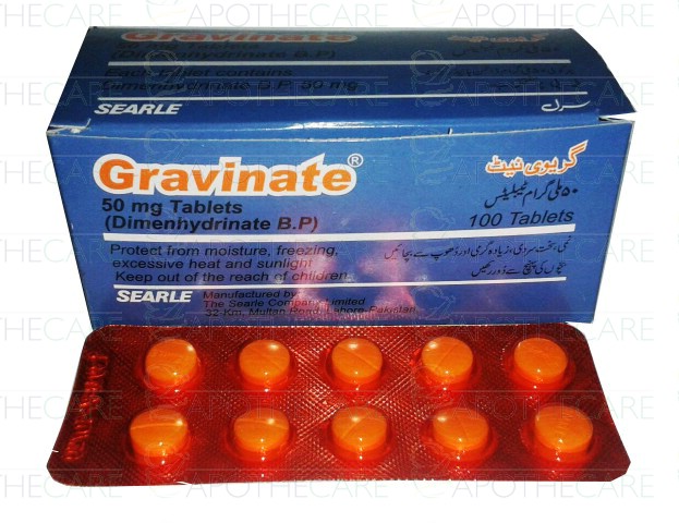 Product Name: Gravinate Tab 50mg 100'sProduct Form: TabletsPack Size: 100'sMarketed By: Searle Pakistan LimitedGeneric Category: Motion SicknessIngredients: Dimenhydrinate