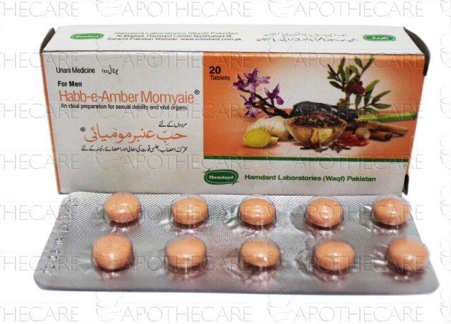 Product Name: Habb-E-Amber Momyaie Tab 20'sProduct Form: TabletsPack Size: 20'sMarketed By: Hamdard Laboratories (Waqf) Pakistan