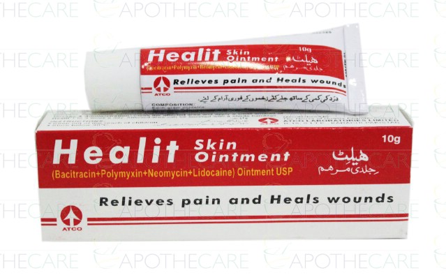 Product Name: HEALIT Skin Oint 10gmProduct Form: OintmentPack Size: 10gmMarketed By: ATCO LABORATORIES (PVT) LTDGeneric Category: Anti-bacterialIngredients: Each gm contains: Bacitracin BP 500 units, Polymyxin B Sulphate BP 5000 units, Neomycin (as Sulphate BP) 3.5 mg, Lidocaine BP 40.0 mg.