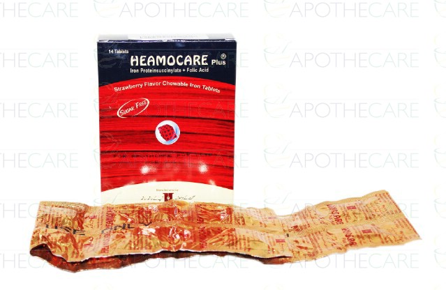 Product Name: Heamocare Plus Tab 400mg/2.5mg 14'sProduct Form: TabletsPack Size: 14'sMarketed By: HIMONT PHARMA (PVT) LTDGeneric Category: Anti-AnemicIngredients: Iron Protein Succinylate 400mg, Folic Acid 2.5mg