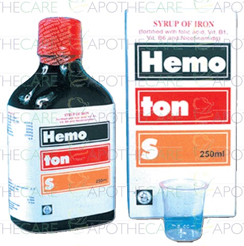 Product Name: HEMOTON-S Syp 250mlProduct Form: SyrupPack Size: 250mlMarketed By: INDUS PHARMA (PVT) LTDGeneric Category: Iron supplementsIngredients: Each 5ml contain: Nicotinamide 10mg, Thiamine HCL 1mg, Folic Acid 0.5mg, Pyridoxine 2mg, Ferric Ammonium Citrate 45mg