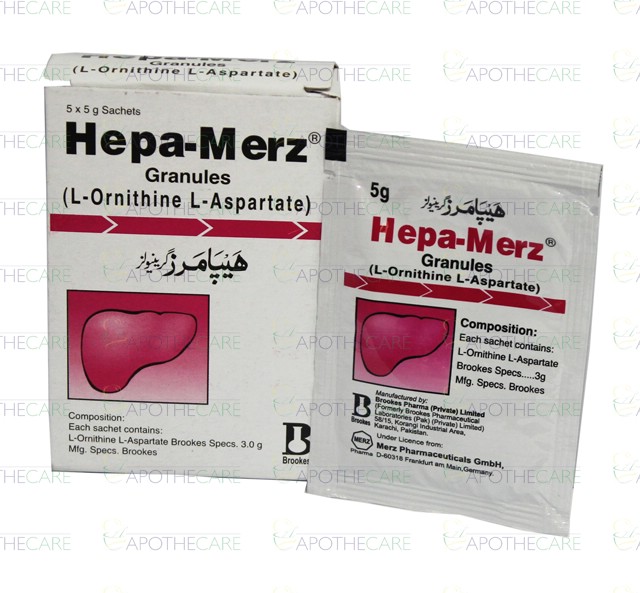 Product Name: Hepa-Merz Granules Powder Sachet 5'sProduct Form: PowderPack Size: 5'sMarketed By: BROOKES PHARMACEUTICAL LABS (PAKISTAN) LTDGeneric Category: Liver ProtectantIngredients: Each Sachet Contains L-Ornithine L-Aspartate 3.0g