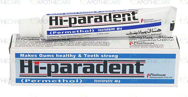 Product Name: Hi-Paradent Tooth paste 40gmProduct Form: Tooth pastePack Size: 40gmMarketed By: Platinum Pharmaceuticals (Pvt) LtdGeneric Category: Oral HygieneIngredients: Permethol