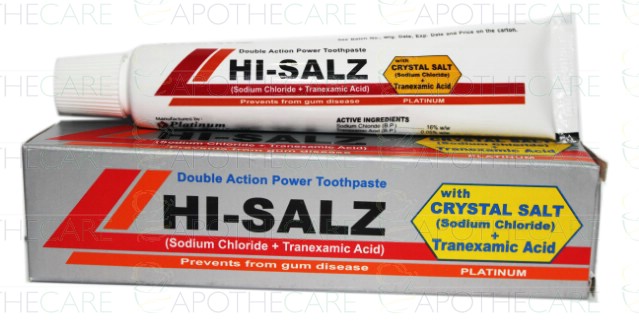 Product Name: Hi-Salz Tooth paste 40gmProduct Form: Tooth pastePack Size: 40gmMarketed By: Platinum Pharmaceuticals (Pvt) LtdGeneric Category: Oral HygieneIngredients: Tranexamic Acid