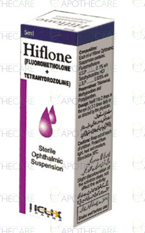 Product Name: Hiflone Eye Drops 5mlProduct Form: DropsPack Size: 5mlMarketed By: Helix Pharma (Pvt) LtdGeneric Category: Anti-AllergyIngredients: Fluorometholone 0.1% ,Tetrahydrazoline HCl 0.02%