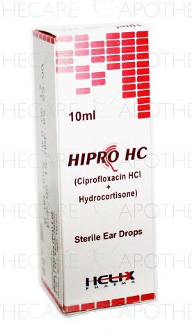 Product Name: Hipro HC Ear Drops 10mlProduct Form: DropsPack Size: 10mlMarketed By: Helix Pharma (Pvt) LtdGeneric Category: Anti-Bacterial + CorticosteroidsIngredients: Ciprofloxacin 2mg ,Hydrocortisone 10mg