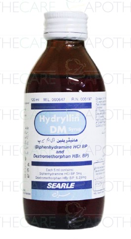 Product Name: Hydryllin DM Syp 120mlProduct Form: SyrupPack Size: 120mlMarketed By: Searle Pakistan LimitedGeneric Category: Anti-TussiveIngredients: Each 5ml contains Dextromethorphan hydrobromide 6.25mg, Diphenhydramine hydrochloride 5mg