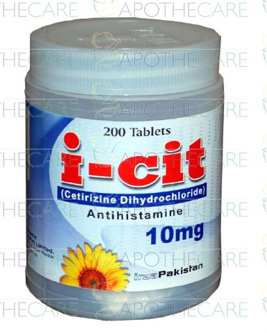 Product Name: I-Cit Tab 10mg 1x200'sProduct Form: TabletsPack Size: 1x200'sMarketed By: IRZA PHARMA PVT LTDGeneric Category: Anti-Histamine Ingredients: Cetirizine Di hydrochloride