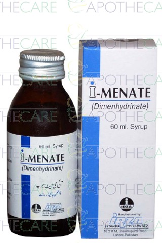 Product Name: I-Menate Syp 12.5mg/5ml 60mlProduct Form: SyrupPack Size: 60mlMarketed By: IRZA PHARMA PVT LTDGeneric Category: MOTION SICKNESSIngredients: Dimenhydrinate