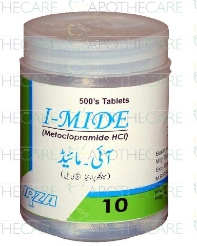 Product Name: I-Mide Tab 10mg 1x500'sProduct Form: TabletPack Size: 1x500'sMarketed By: IRZA PHARMA PVT LTDGeneric Category: GASTROPROKINETICIngredients: Metoclopramide HCl