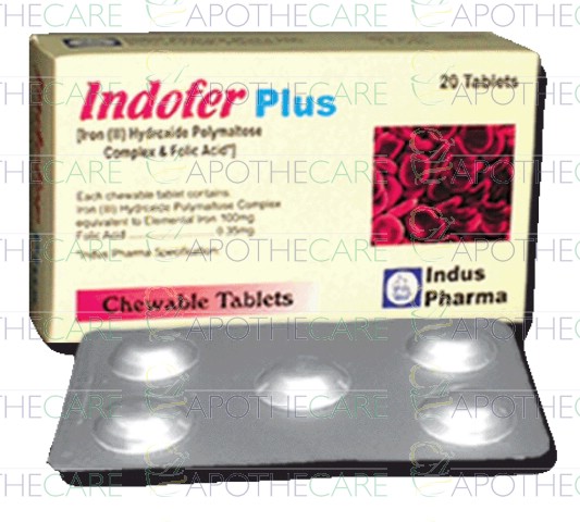 Product Name: Indofer Plus Tab 100mg/0.35mg 20'sProduct Form: TabletsPack Size: 20'sMarketed By: INDUS PHARMA (PVT) LTDGeneric Category: Anti-AnemicIngredients: Iron Polymaltose Complex 100mg, Folic Acid 0.35mg