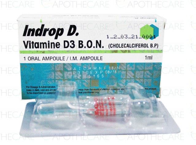 Product Name: Indrop-D Oral Inj 200000IU 1Ampx1mlProduct Form: InjectionPack Size: 1Ampx1mlMarketed By: NEUTRO PHARMAGeneric Category: VITAMIN D ANALOGUE Ingredients: Cholecalciferol