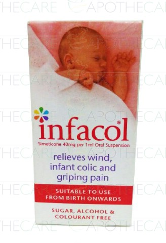Product Name: Infacol Drops 40mg/ml 50mlProduct Form: DropsPack Size: 50mlMarketed By: Well Come PakistanGeneric Category: Anti-FlatulantIngredients: Simethicone 40mg per 1ml Oral Suspension.